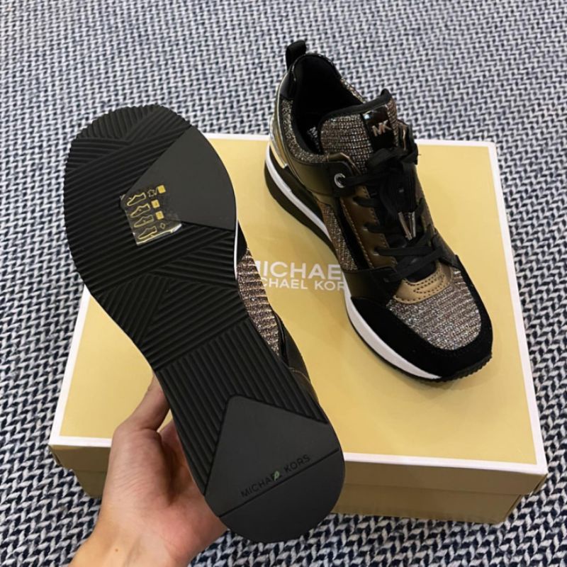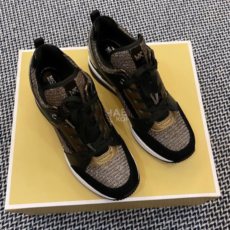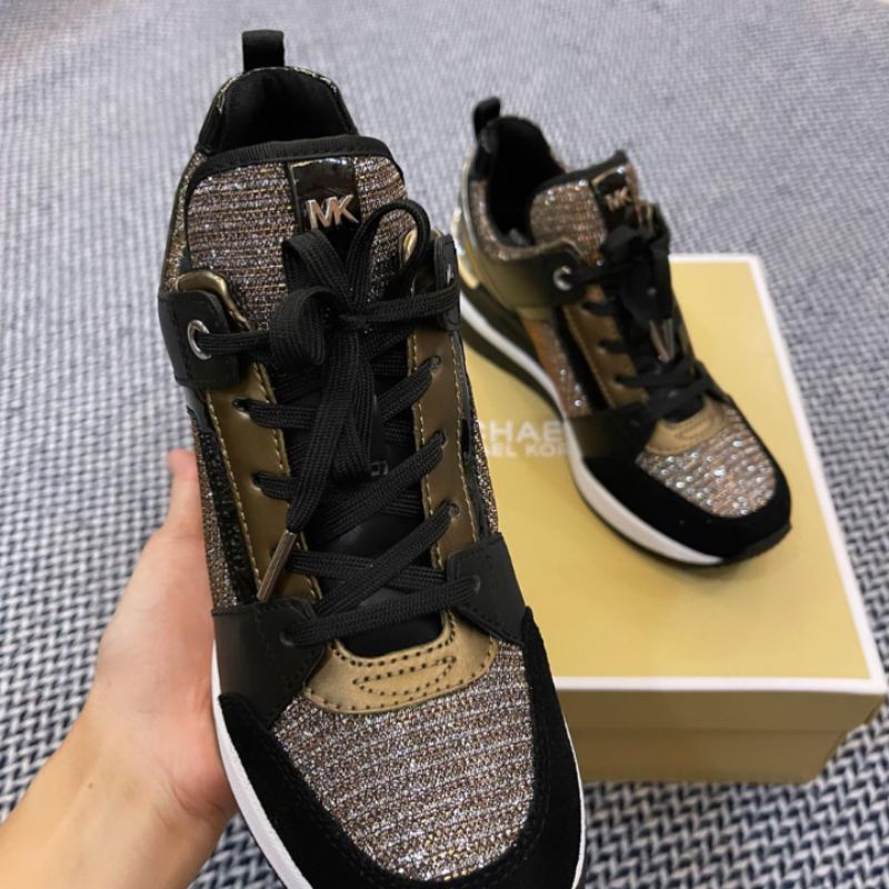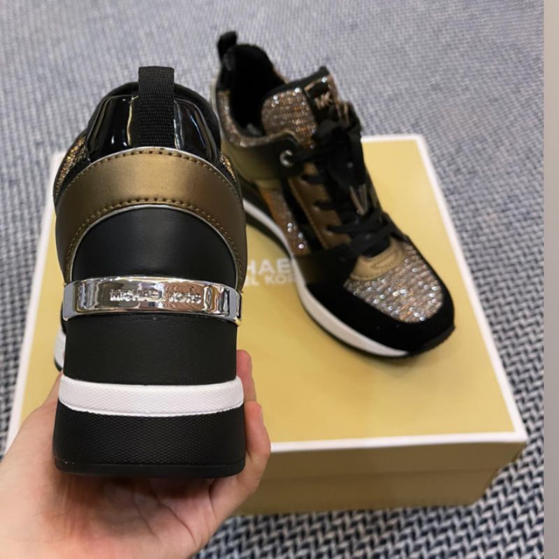 Ready stock. Authentic original Michael Kors. From Michael Kors, the Georgie Glitter Leather Wedge Trainer Sneakers.
